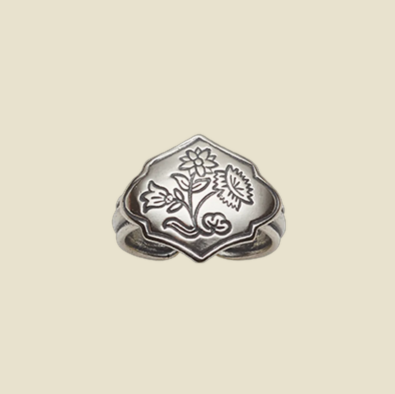 Bunadsring er nydelig tilbehør og ei fin gave å gi til konfirmanten eller noen andre du bryr deg om. Denne ringen er laget i oksidert sølv og passer perfekt til Nordlandsbunaden. Blomstermotivet er inspirert av det vakre broderiet på bunaden. Ringen er justerbar og finnes også i hvitt sølv.