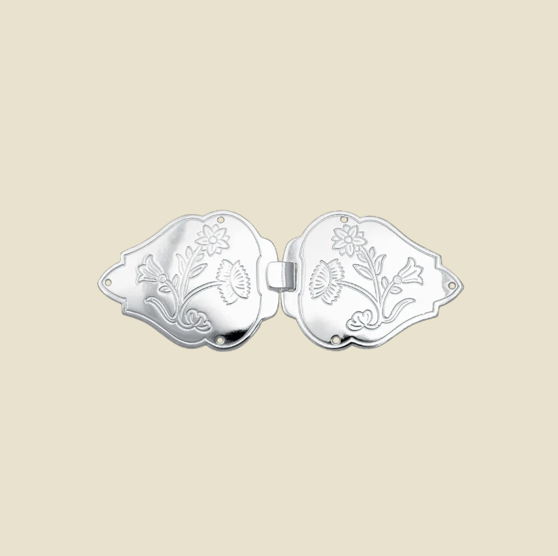 Capespenne i hvitt sølv til Nordlandsbunaden. Spenna har det samme, vakre blomstermotivet du finner på resten av bunadsølvet til Nordlandsbunaden.