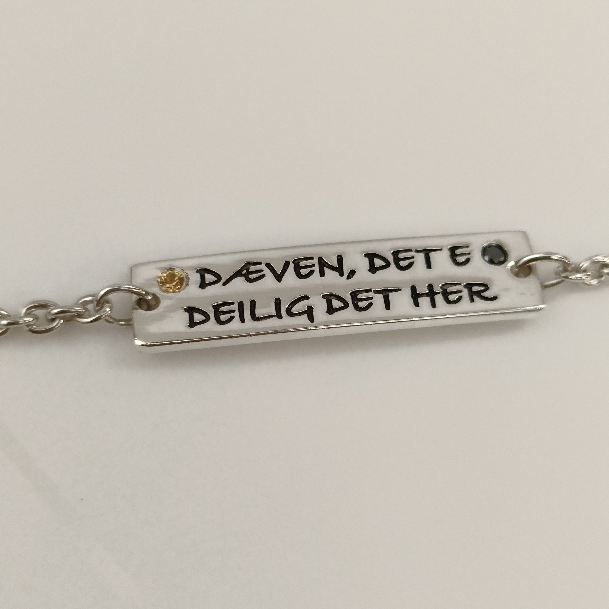 Råstilig armbånd i sterlingsølv gravert med teksten "Dæven, det e deilig det her". Anhenget er dekorert med en gul safir og en sort diamant.