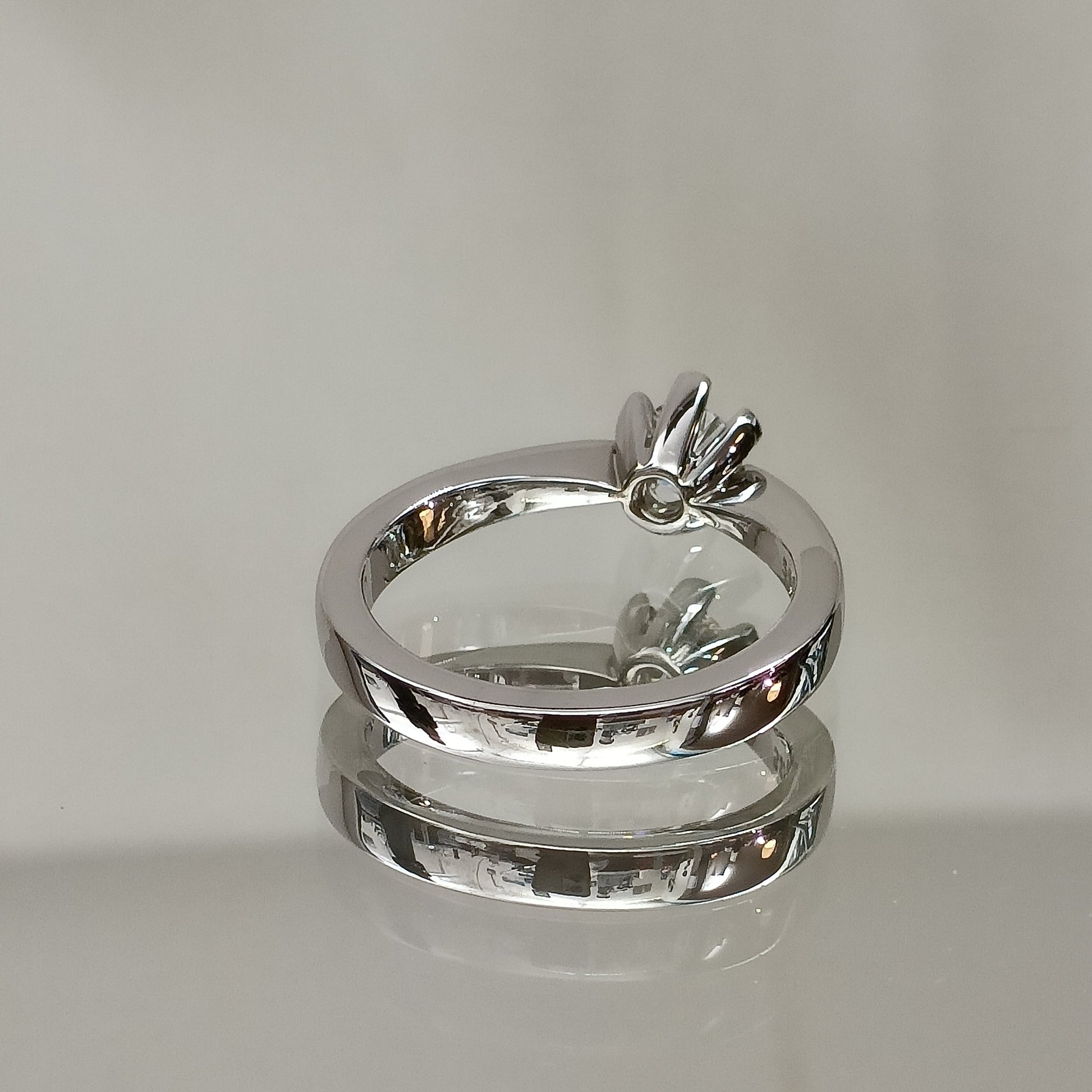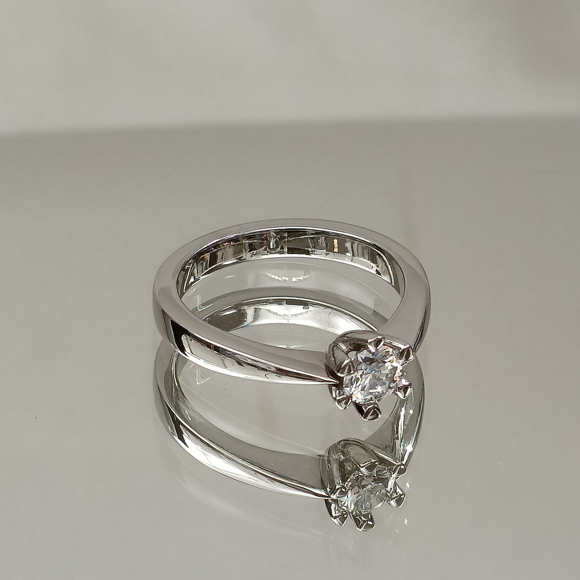 Unik enstensring med 6 klør laget i 14karat (585) hvitt gull. Ringskinnen er lett rektangulær som gir ringen et stilrent uttrykk, samtidig som den er svært behagelig å bruke. Diamanten utgjør 0,40ct.