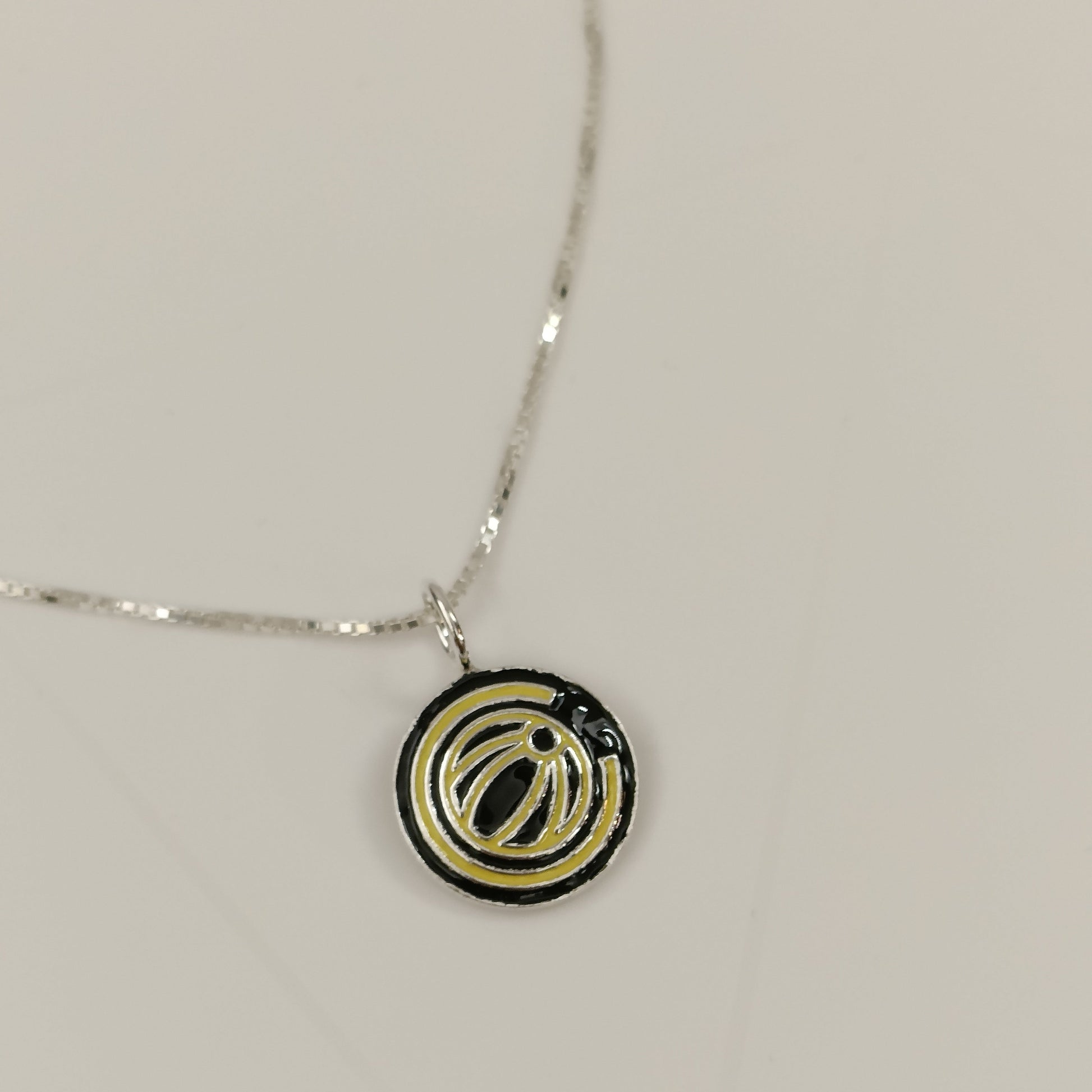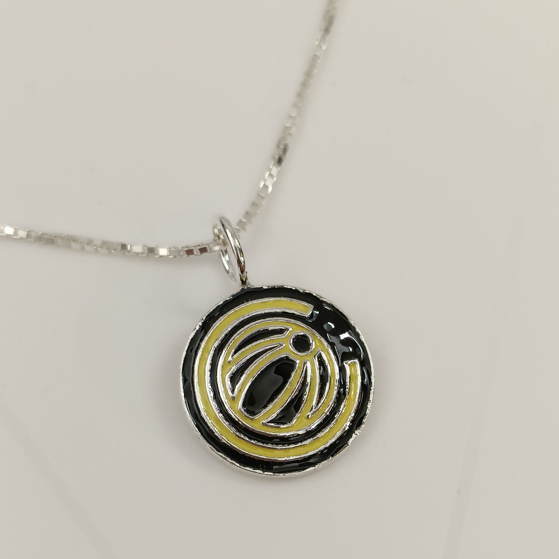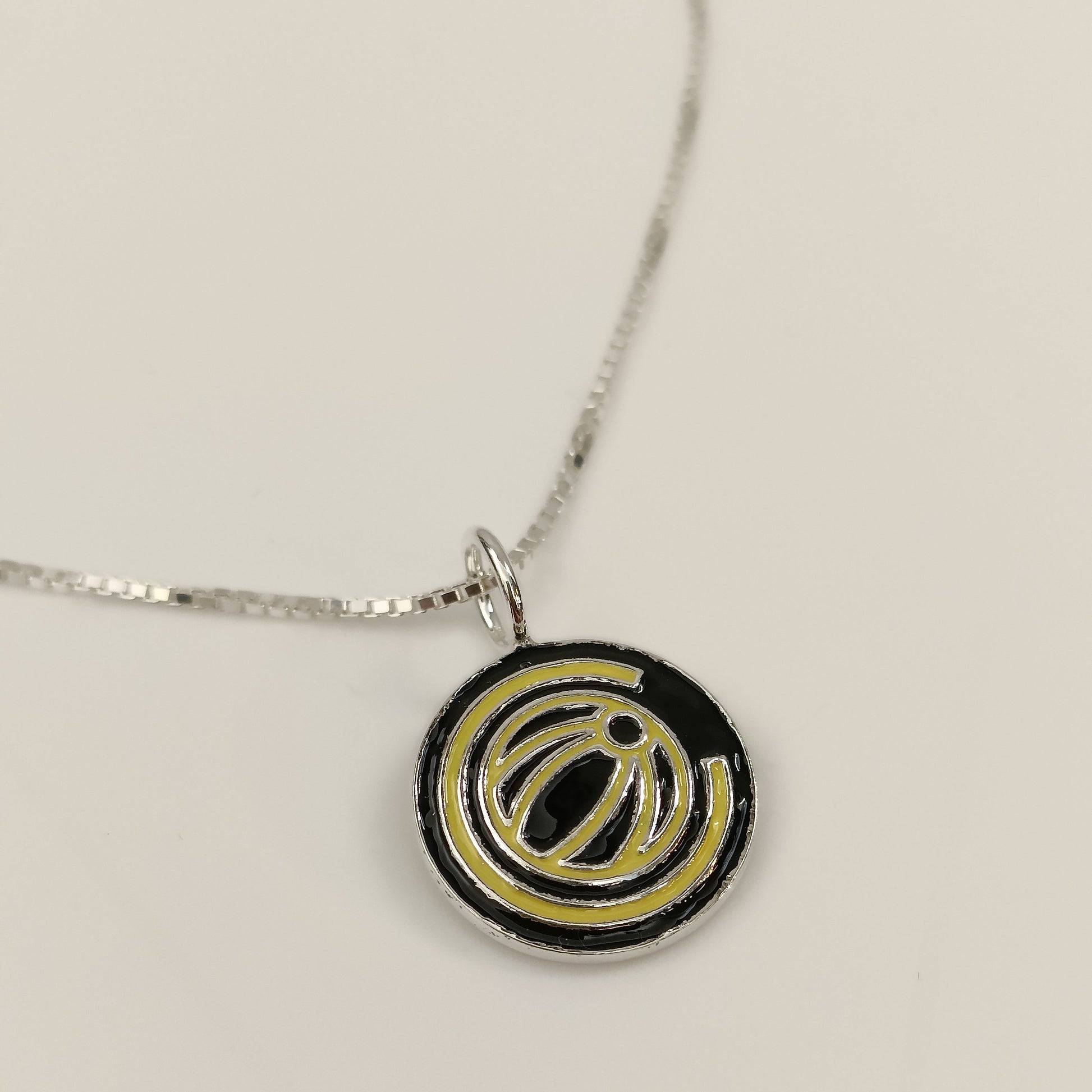 Stilig anheng fra Embla i sterlingsølv, håndmalt med glassemalje i gult og sort. Anhenget kommer med et kjede i sterlingsølv