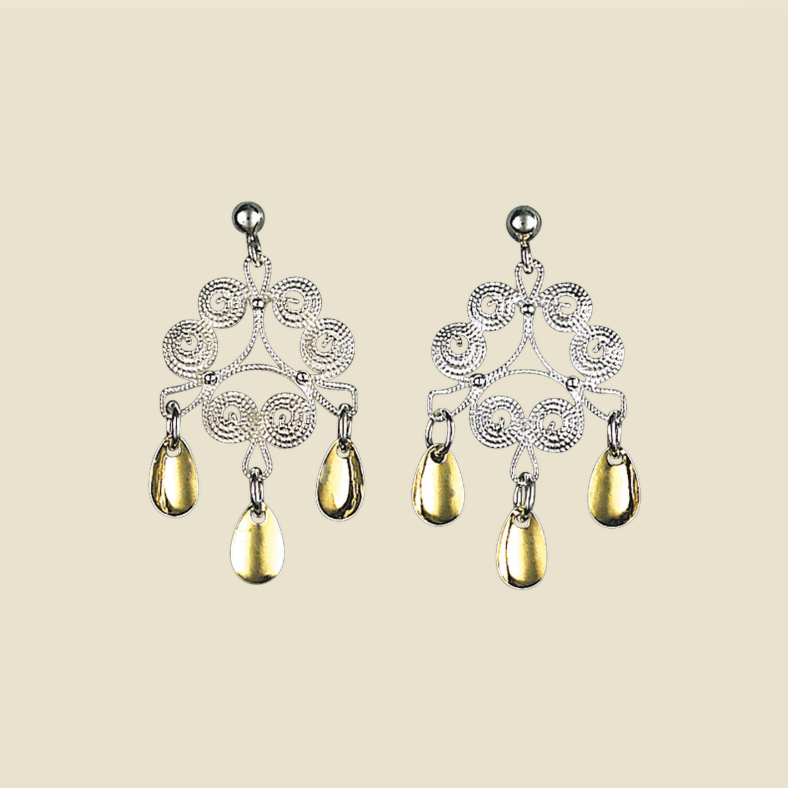 Vakker ørepynt i hvitt sølv til Nordlandsbunaden. Ørepynten har tre dråpeformede løv i forgylt sølv.