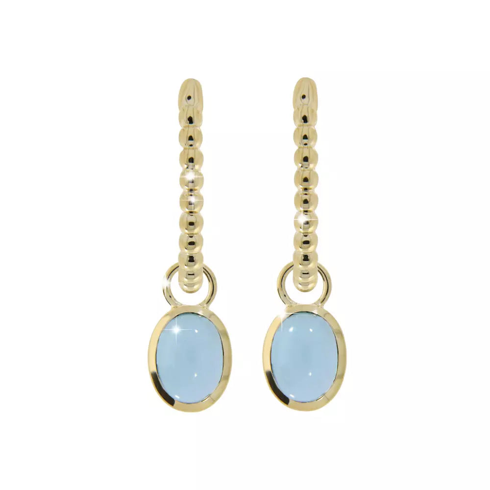 Vakker ørepynt i 14karat (585) gull. Øreringene har flotte detaljer og en cabochon slipt topas. Anhenget kan tas av slik at du kan bruke øreringene på flere måter. Den gode klikk-låsen gjør de svært behagelig å bruke.