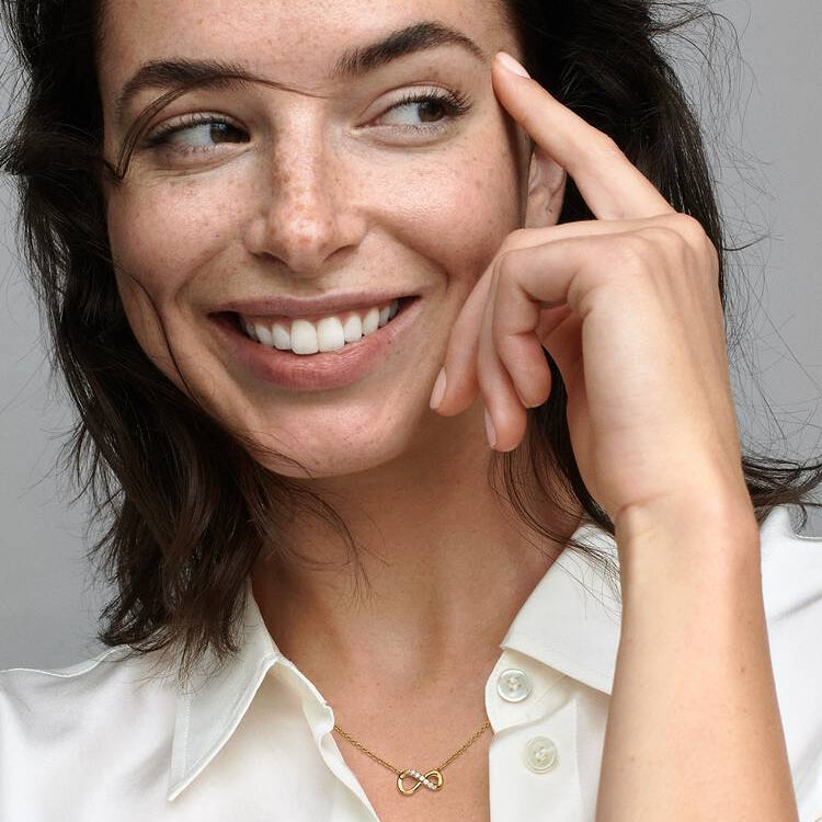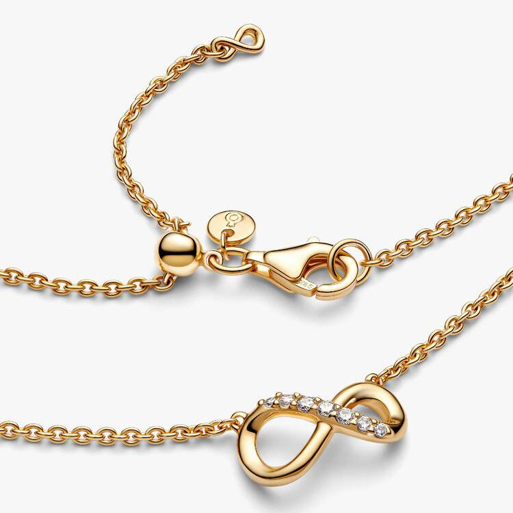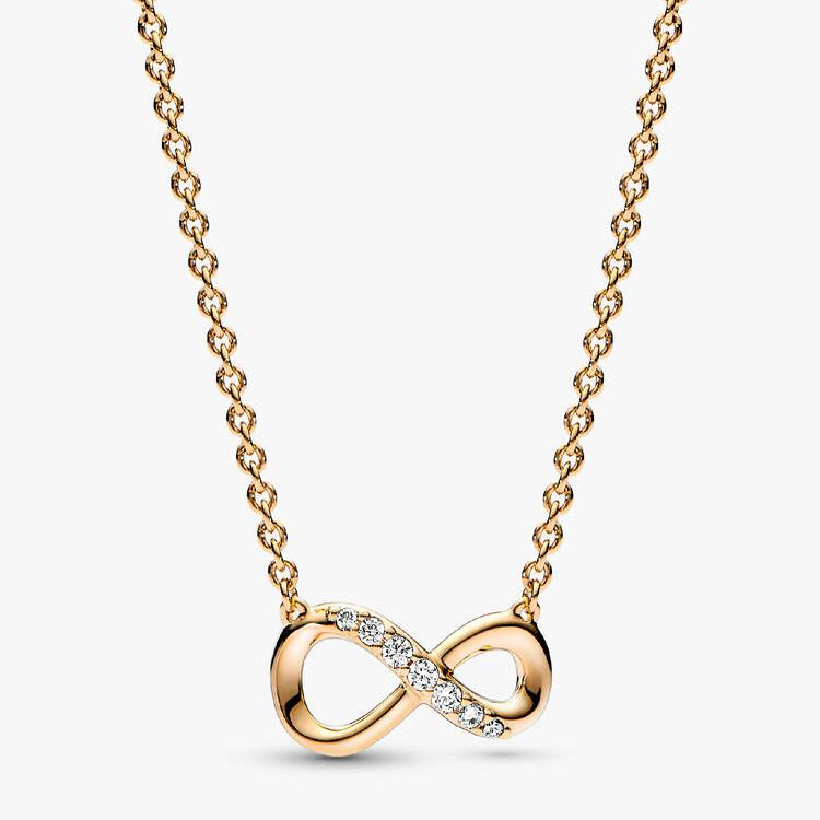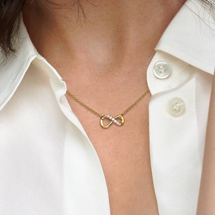 Feir evig kjærlighet med Funklende Evighet Collierhalskjede. Smykket med et fast anheng belagt med 14k gull formet som et evighetssymbol, som symboliserer kraften i evigvarende bånd og tjener som en påminnelse om kjærlig