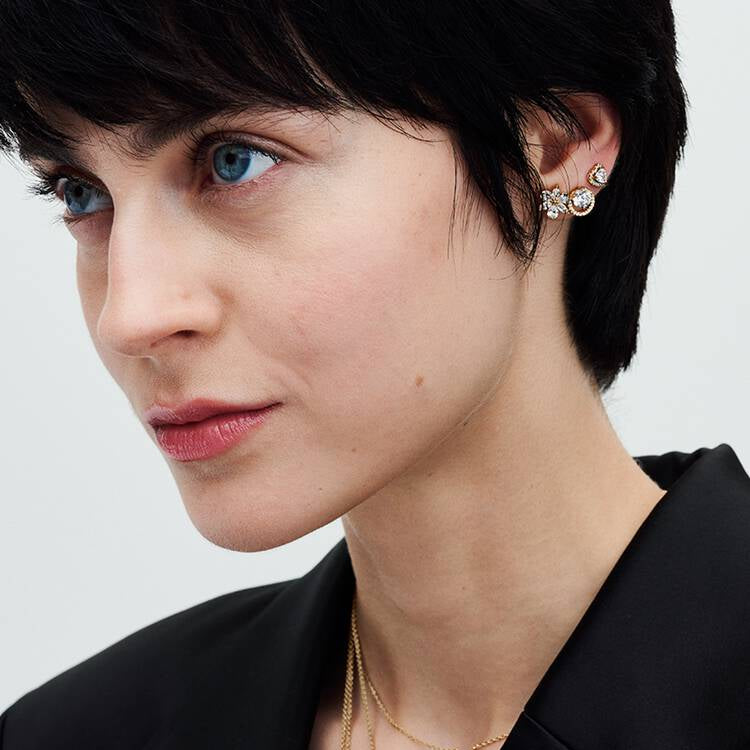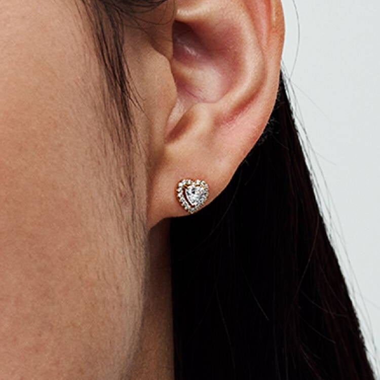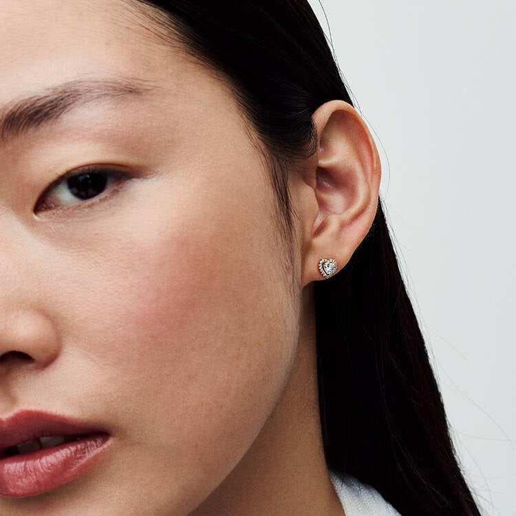 Pynt deg med en tidløs klassiker med disse håndbearbeidede øredobbene. Hver øredobb kommer med en hevet klar hjerteformet stein omgitt av funklende kubisk zirkonia, som danner en kontrast mot de varme tonene fra belegget i 14k gull.