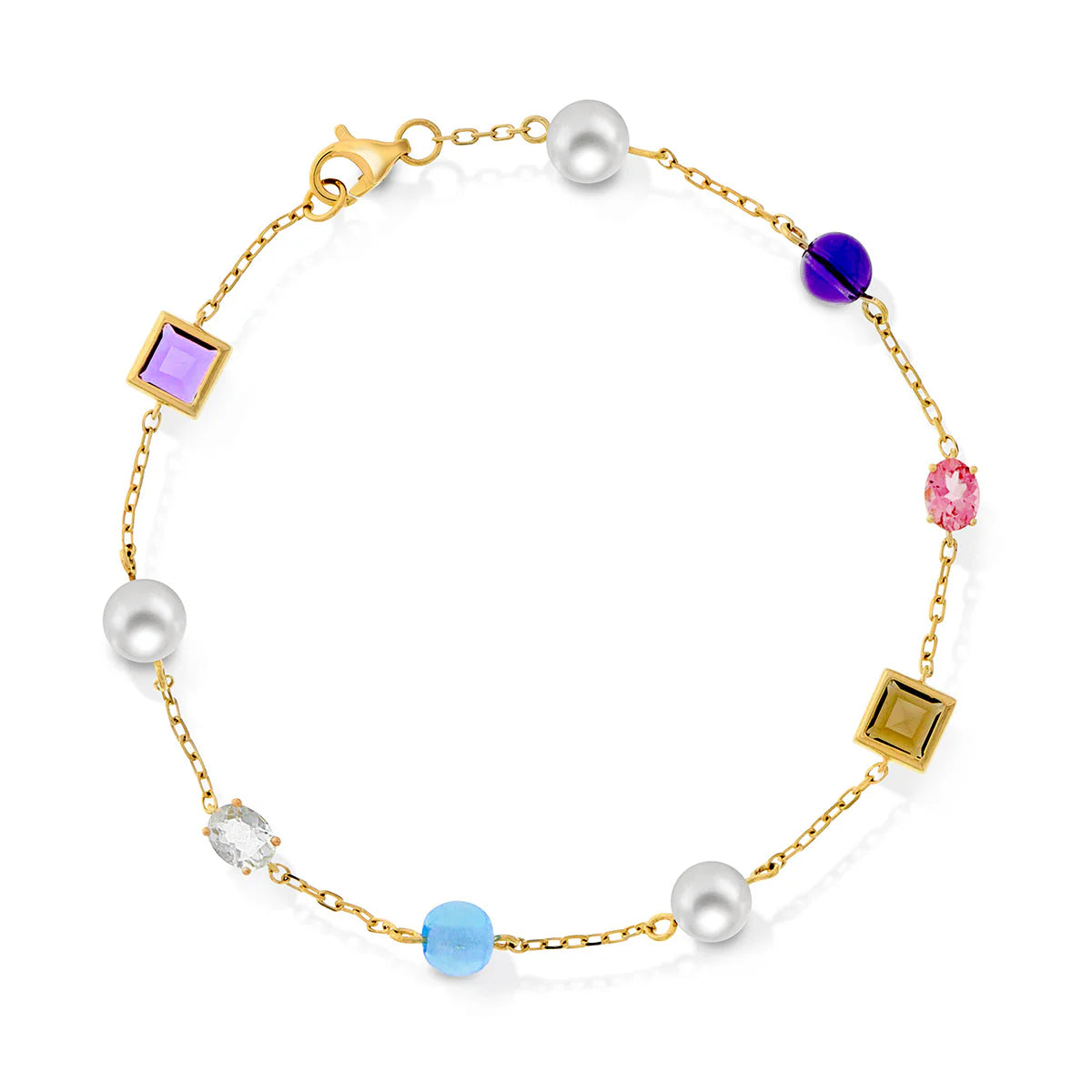 Lekent perlearmbånd i 14 karat gult gull med en harmonisk miks av edelstener og ferskvannsperler. Hver lenkedel er prydet med en unik kombinasjon av glatte og fasetterte stener i ulike farger og former, balansert av silkemyke hvite perler. Samspillet mellom materialene gir smykket et fargerikt og sofistikert uttrykk.