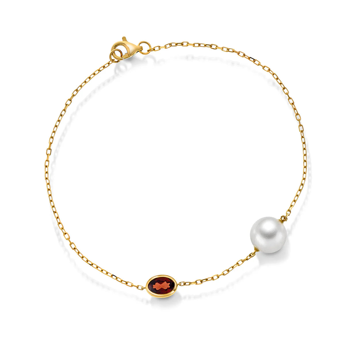 Sofistikert armbånd i 14karat (585) gult gull med en dyp rød granat på 0.55 ct og en 8 mm ferskvannsperle. Granaten gir et intenst og raffinert fargespill som kompletteres av perlens silkemyke overflate og gullens varme glød. Det lette kjedet gir smykket et moderne og delikat preg.